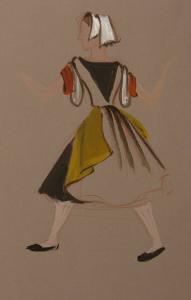 Costume Design- female figure in brown and ochre dress, seen in profile