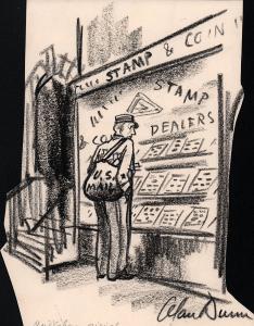 No caption (postman looking in stamp dealer's window)