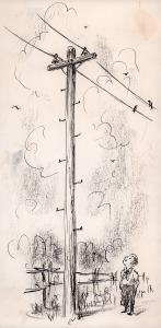 [Boy looking at telephone pole]