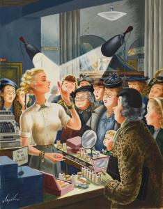 Salesgirl demonstrating cosmetics to other women "How to be beautiful"