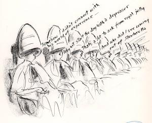 "Somehow I didn't connect with his world of experience -", "Why not start the day with a degreaser.", "That's a lot to ask from royal jelly.", "And who did I see coming out of Slenderella."