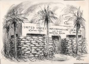 No caption (sand bags and barbed wire around U.S. Information Service Reading Room)