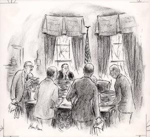 No caption (men with books/papers at President's desk)