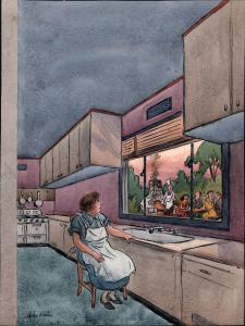 [Cook sitting in kitchen, looking out window to BBQ]