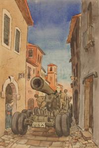 No caption (cover illustration - US Army Mobile Howitzer driving on European Street)