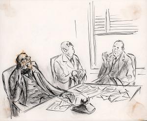 Skip to main content Collections MenuExpandMy CollectionDownload 300 x 300 (Download)View PDFNo caption (Three men sitting around desk)PreviousNext 300 x 300 (Download)No caption (Three men sitting around desk)Artist Alan Dunn (American, 1900 - 1974)Date1957ClassificationsCartoonMediumcrayon inkCredit LineMary Petty and Alan Dunn BequestObject number1979.2172 Discover More No caption (men with books/papers at President's desk)Alan Dunn1964No caption (Eight men sitting around a table)Mary Petty"Come, come! How does it look to see a lot of men yawning around the place?"Alan Dunn1933No caption (man at desk - woman in chair)Alan Dunn1970No caption (black man at desk in hut)Alan Dunn1962No caption (man at personnel desk)Alan Dunnc 1950No caption (exchange desk)Alan Dunn1942No caption (soldier putting army memorabelia around living room)Alan Dunn1945No Caption (Christmas wreath around elevator buttons)Alan Dunn1950No caption (kids around corner)Alan Dunn1960No caption (barbed wire and machine guns around fall-out shelter)Alan Dunn1961No caption (sand bags and barbed wire around U.S. Information Service Reading Room)Alan Dunn1965 Powered by eMuseum
