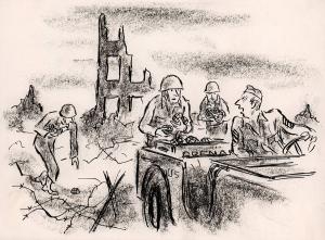 "Hurry, now, men - Remember...." (soldiers collecting hand grenades.)
