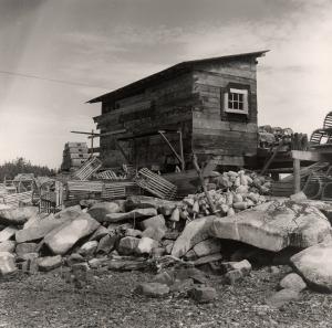 Fishing shack with lobster traps, dory and buoys (Stonington, Maine?);