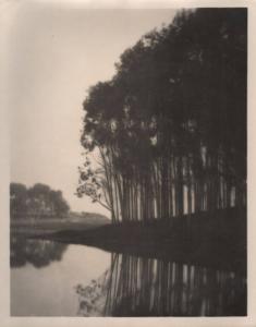 untitled [landscape, group of trees silhouetted, water’s edge]