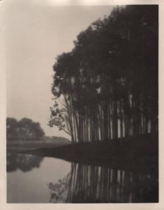 untitled [landscape, group of trees silhouetted, water’s edge]