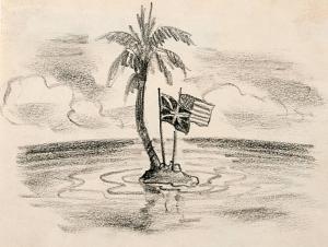 [British and American flags on tropical island]