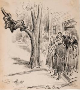 No caption (man in tree taking snapshot)