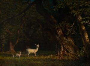Albino Doe and Two Fawns in Forest
