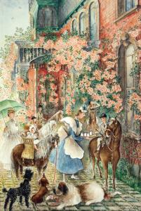 No caption (Fay serving milk to young riders)