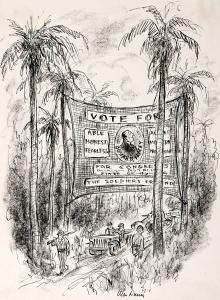 No caption (Vote for Josiah B. Tracey banner hanging over a supply route in the war zone)