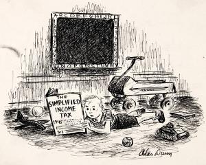 No caption (young boy lying on the floor reading "The Simplified Income Tax, 1945")