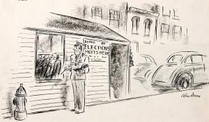 No caption (policeman ticketing mobile Board of Elections trailer for parking too near a fire hydrant);