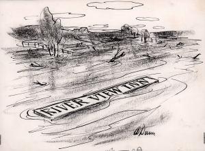 No caption ("River View Inn" sign floating in flood water)