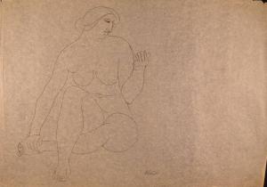 [Seated nude woman looking at hand]