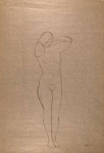 [Standing nude woman with hands behind head]