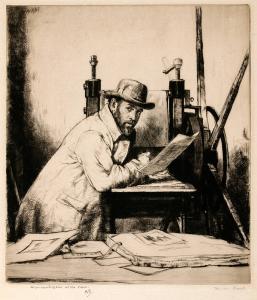Skip to main content Collections MenuExpandMy CollectionView PDFMuirhead Bone at the PressPreviousNext 300 x 300 (Download)Muirhead Bone at the PressArtist Francis Dodd (Welsh, 1874 - 1949)Date1908ClassificationsPrintMediumEtching and drypointDimensions12 1/4 x 10 3/4 in.Credit LineGift of Mr. Cloud WamplerObject number1966.2169 Discover More Little RefugeeFrancis Dodd1917CoalmenFrancis Dodd1915[Out of study window]Francis Seymour Haden1859A Brig at AnchorFrancis Seymour Haden1870Combe BottomFrancis Seymour Haden1860Village Ford IFrancis Seymour Haden1881Horsley's CottagesFrancis Seymour Haden1865[Shere Mill Pond (large plate)]Francis Seymour Haden1860Hands Etching-O LaborumFrancis Seymour Haden1865Portrait of Francis Seymour Haden (No. 2)Francis Seymour Haden1862A By-Road in TipperaryFrancis Seymour Haden1860Egham LockFrancis Seymour Haden1859 Powered by eMuseum