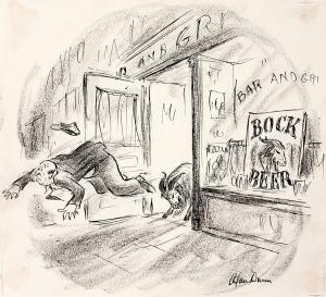 No caption (man being "rammed" out of bar and grill, Bock Beer advertising in window)
