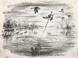 No caption (deep-sea hunter shooting duck with arrow)