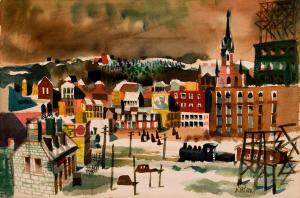 [Town scene with train]