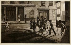 Skip to main content Collections MenuExpandMy CollectionView PDFBedford Street GangPreviousNext 300 x 300 (Download)Bedford Street GangArtist Martin Lewis (American, born Australia, 1881 - 1962)Date1936ClassificationsPrintMediumDrypoint and sandpaper groundDimensions9 × 14 in.Credit LineMuseum purchaseObject number1967.0155 Discover More Day's EndMartin Lewis1937Glow of the CityMartin Lewiscirca 1929Fifth Avenue BridgeMartin Lewis1928Trees at GotembaMartin Lewis1925Dock Workers Under the Brooklyn BridgeMartin Lewiscirca 1916The Orator, Madison SquareMartin Lewis1916On The RiverMartin Lewis1915AdirondacksLewis C. Daniel1928Woman Taken in AdulteryLewis C. Danielno dateGowanus Canal (Working the Docks)Allen Lewis1915Sharpening the Scythe (Beim Dengeln) Käthe Kollwitz1905 (restrike, 1921)Street at SaverneJames McNeill Whistler1858 Powered by eMuseum