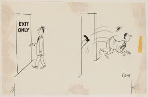 No caption - man kicked out of "Exit Only" door; 2 images, NY