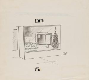 No caption - sign next to safe in store window, "For The Man Who Has Everything"