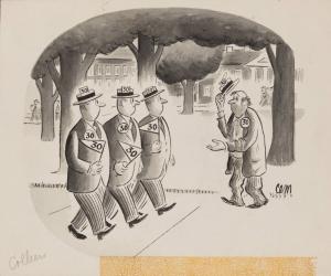 No caption - Class of 1930 member asking for hand-outs during class reunion.
