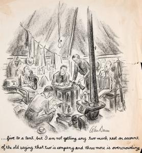"...five to a tent, but I am not getting any two much rest on account of the old saying that two is company and three more is overcrowding."