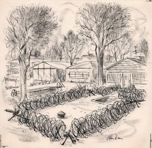 No caption (barbed wire and machine guns around fall-out shelter)