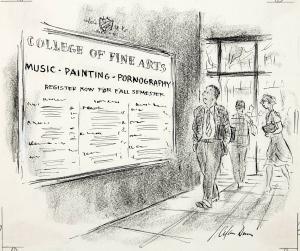 No caption (young man walking past College of Fine Arts Poster offering courses in "Music Painting Pornography")
