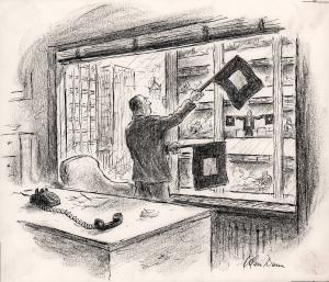 No caption (businessmen using semaphore to transmit messages from one bulding to another.)
