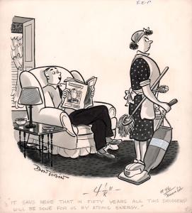 It says here that in fifty years all this drudgery will be done for us by atomic energy.