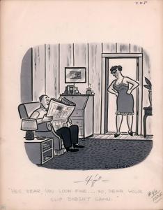 Skip to main content Collections MenuExpandMy CollectionView PDFYes, dear, you look fine... No, dear, your slip doesn't show.PreviousNext 300 x 300 (Download)Yes, dear, you look fine... No, dear, your slip doesn't show.Artist Don Tobin (American, 1916 - 1995)Dateno dateClassificationsCartoonMediumInk and ink washDimensionsSheet: 14 5/16 × 11 1/4 in. (36.3 × 28.6 cm)Credit LineLibrary TransferKeyword/SubjectdomestichumorObject number1989.051 Discover More You go ahead, dear. I'll stay here and study this one.Don Tobinn.d.It's nothing to me what your little boy did with your ticket.Don Tobinno dateI don't care if he is your rich uncle I think we're going to too much trouble for his visit!Don Tobinno dateHello, Mother-We Were Just Talking About You.Don Tobinno dateI'm sorry folks, these seats are saved.Don Tobinn.d.Boy! Carry Mr. Brown and his groceries out to his carDon Tobinn.d.George, the most wonderful thing happened today! We got a $130 refund on our income tax!Don Tobinn.d.When I get married I'm going to have a simple wedding with hamburgers;Don Tobinno dateThat Plate is Dry Enough!Don Tobinno dateIt says here that in fifty years all this drudgery will be done for us by atomic energy.Don Tobinno dateI'm afraid you're sitting in his favorite chair, Mabel.Don Tobinn.d.Smells good- what is it?Don Tobinn.d. Powered by eMuseum