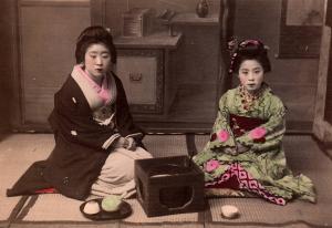 Two women- painted interior background