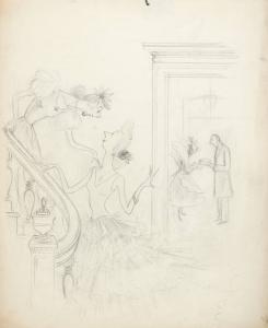 No caption (Two women on stairs, two figures in background)
