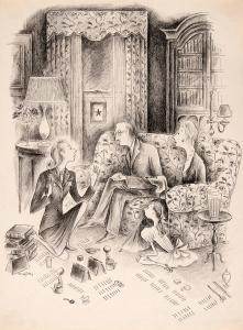 No caption (Four figures in an interior with dog)