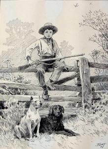 Boy on Fence Holding a Rifle, with Two Dogs