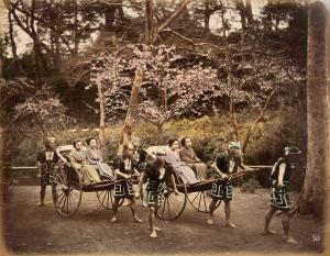 [Rickshaws with four women and rickshaw coolies]
