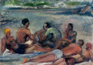 [Six figures on beach]