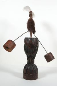 [Standing carved figure balanced atop a wooden base by two weights]