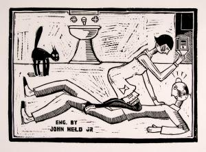 Woman Hitting a Man Over the Head with a Bottle as Cat Looks on.
