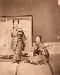 Two women, with fan and shamisen