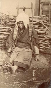 Woman with back carrier for wood