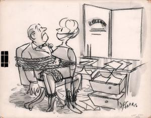 no caption (man and woman chained together in chair in an office)