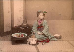 [Young girl in a kimono sitting next to a platter of Sushi]